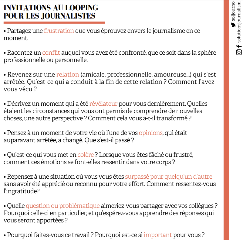 Aussi surprenant que cela puisse paraître, l’écoute n’est pas une compétence enseignée dans les écoles de journalisme. Pire, on confond cette capacité avec une injonction à obéir ou à se soumettre (pensez à ce que l’on demande aux enfants quand on leur demande d’écouter…!). Résultat : “l’écoute est rarement perçue comme une compétence à acquérir. Pourtant, c’est un instinct de survie dont on s’est coupé !”, note Nina avant de poursuivre : “nombreux sont les journalistes qui craignent que cela ne prenne trop de temps. Mais une vraie capacité d’écoute, travaillée comme nous l’enseignons (notamment avec la technique du “looping - voir l’image ci-dessous), permet d’accéder à d’autres types d’information - plus authentiques, ou contenant un nouvel éclairage. J’avais l’intuition que c’était une évidence, mais cette question de l’écoute est un impensé total : les journalistes que je forme réalisent souvent qu’ils et elles ne savent pas bien écouter.”