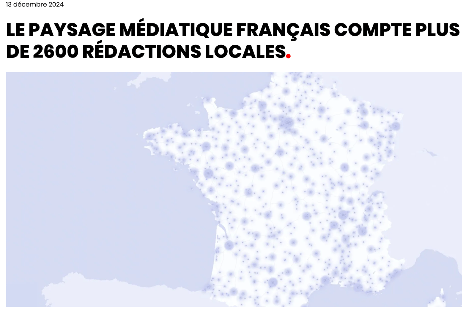 Tant que nous sommes dans les cartes : Acrimed/Le Monde Diplo a actualisé sa carte des actionnaires des médias dominants, et le OuestMediaLab a lancé sa très attendue carte de France des rédactions locales : il y en a 2600 au total !
