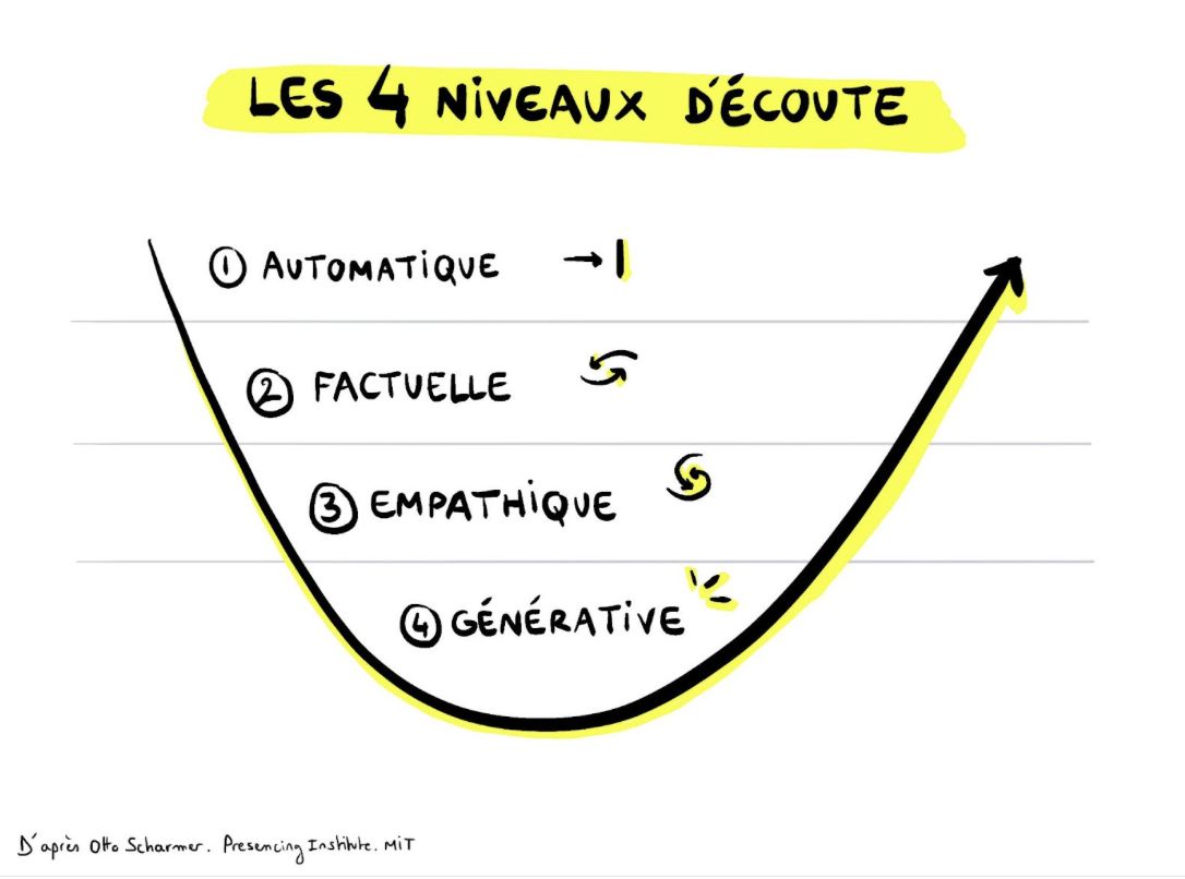 Je vous signale aussi l’excellente newsletter Redessiner le monde, de Matthieu Dardaillon, cofondateur de Ticket for change, qui cet été abordait, cet été, un outil éprouvé lors de ses formations, tiré de la méthode d’Otto Scharmer, professeur au MIT créateur de la théorie en U. L’idée est qu’il existerait 4 niveaux d’écoute, menant à 4 qualités de conversation, et permettant 4 niveaux de transformation
